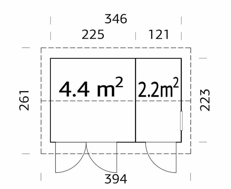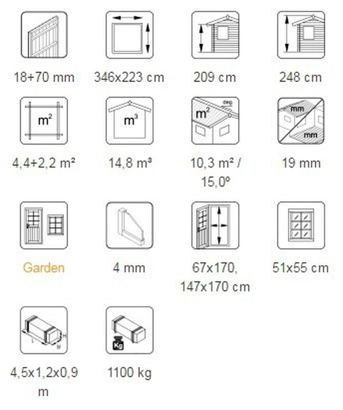 SPÉCIFICATIONS DU PRODUIT: Dimensions du mur: 346 x 223 cm Hauteur du mur: 209 cm Volume: 16,0 m3 Type de porte / fenêtre: Été Porte / fenêtre en verre: vrai verre, 4 mm Fenêtre fixe, dimensions du passage: 51 x 55 cm Porte , dimensions du passage: 138 x 181, 78 x 181 cm Cadre de porte: bois Lames de toit: 19 mm Surface du toit: 11,0 m2 Pente du toit: 4,4º Poids: 1250 kg NOUS RECOMMANDONS: -Peinture vernis à l'eau ou Peinture Lasur (qui pénètre profondément dans le bois, laissant le bois respirer et ne formant pas de film). ACCESSOIRES OPTIONNELS: - 3 rouleaux de toile d'asphalte - 1 boîte de clous (pour les bardeaux de toile ou d'asphalte) - Tube d'évacuation QVVRlame4