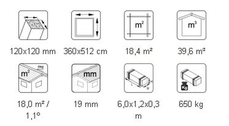 SPÉCIFICATIONS DU PRODUIT: Dimensions extérieures: 360 x 512 cm Hauteur du mur: 215 cm Volume: 39,6 m3 Lames de toit: 19 mm Surface du toit: 18,0 m2 Pente du toit: 1,1º Poids: 650 kg NOUS VOUS CONSEILLONS EN CAS DE CHOIX SANS TRAITEMENT : -Peinture vernis à l'eau ou peinture Lasur (qui pénètre profondément dans le bois, laissant le bois respirer et ne formant pas de film). QUEL EST LE TRAITEMENT? Comme nous avons nos propres bains de traitement pour le traitement par trempage brun, gris et transparent, les cabines et autres articles plus grands peuvent être commandés traités avec le liquide de traitement soluble dans l'eau Axil 3000 P de Sarpap & Cecil Industries, garantissant traitement dans les classes 1-3. En plus des composants qui protègent le bois contre les dommages biologiques et la protection contre les rayons UV, cet apprêt peut contenir trois pigments différents. Le traitement par trempage brun et gris peut rehausser la couleur de votre maison, mais le trempage transparent fonctionne pour l'étape de préparation avant la peinture. Le pigment s'estompe progressivement avec le temps, mais cela n'a aucun effet négatif sur les performances du traitement. ACCESSOIRES OPTIONNELS: - 6 rouleaux de toile d'asphalte - 1 boîte de clous (pour le tissu ou les dalles d'asphalte) - EPDM: YEPDM4662 - 1 paquet de tuyau de vidange QVVRlame4 - 6 Support pour abri d'auto QLP80 - Voûte en bois stratifié LACP-kaar
