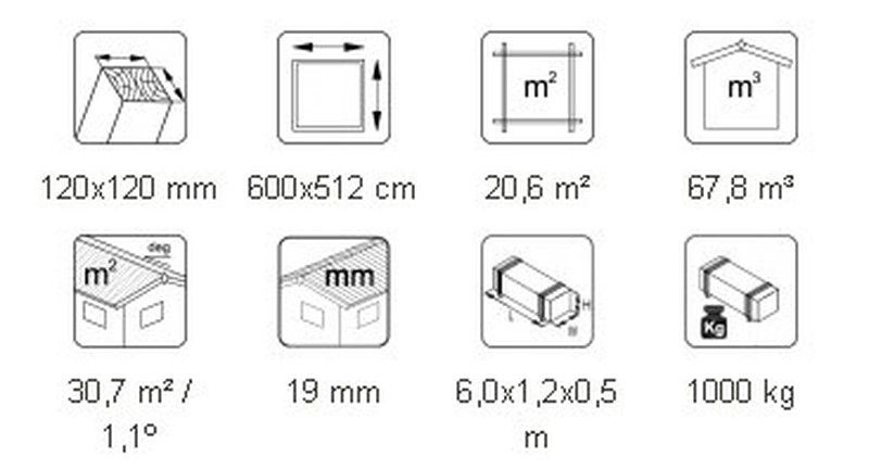 CARACTÉRISTIQUES DU PRODUIT: Dimensions extérieures: 600 x 512 cm Hauteur des murs: 221 cm Volume: 63,8 m3 Panneaux de toit: 19 mm Surface du toit: 30,7 m2 Pente du toit: 1,1º Poids: 800 kg NOUS VOUS CONSEILLONS EN CAS DE CHOIX SANS TRAITEMENT : -Peinture vernis à l'eau ou peinture Lasur (qui pénètre profondément dans le bois, laissant le bois respirer et ne formant pas de film). QUEL EST LE TRAITEMENT? Comme nous avons nos propres bains de traitement pour le traitement par trempage brun, gris et transparent, les cabines et autres articles plus grands peuvent être commandés traités avec le liquide de traitement soluble dans l'eau Axil 3000 P de Sarpap & Cecil Industries, garantissant traitement dans les classes 1-3. En plus des composants qui protègent le bois contre les dommages biologiques et la protection contre les rayons UV, cet apprêt peut contenir trois pigments différents. Le traitement par trempage brun et gris peut rehausser la couleur de votre maison, mais le trempage transparent fonctionne pour l'étape de préparation avant la peinture. Le pigment s'estompe progressivement avec le temps, mais cela n'a aucun effet négatif sur les performances du traitement. ACCESSOIRES OPTIONNELS: - 7 rouleaux de toile d'asphalte - 1 boîte de clous (pour le tissu ou les dalles d'asphalte) - EPDM: YEPDM7662 - 1 paquet de tuyau de vidange QVVRlame6 - 6 Support pour abri d'auto QLP80 - Arceau de bois lamellé LACP-kaar