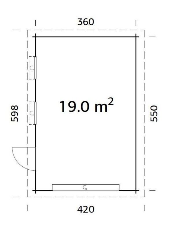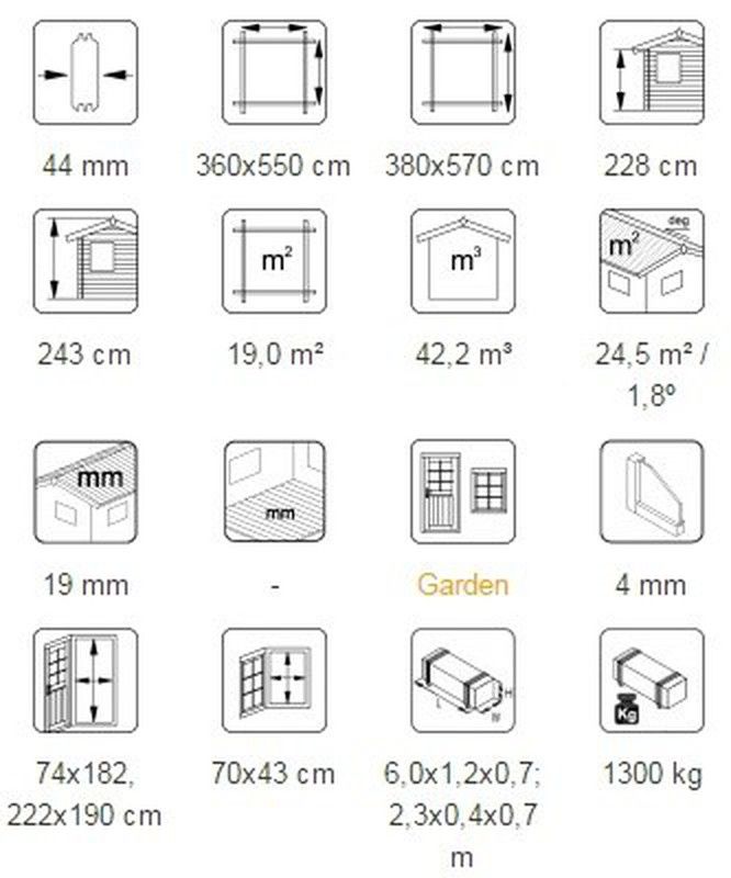 CARACTÉRISTIQUES DU PRODUIT: Dimensions extérieures: 3800 x 570 cm Hauteur du mur: 228 cm Volume: 42,2 m3 Type de fenêtre / porte: Jardin Porte / fenêtre en verre: vrai verre, 4 mm Fenêtre, mesures de passage: 70 x 43 cm Porte, mesures de passage: 74 x 182 cm Porte de garage: sectionnelle 225 x 194 cm Lames de toit: 19 mm Surface de toit: 24,5 m2 Pente de toit: 1,8º Poids: 1300 kg NOUS RECOMMANDONS: -Peinture vernis à l'eau ou peinture Lasur (qui pénètre profondément dans le bois en laissant le bois respirer et ne formant pas de film). ACCESSOIRES EN OPTION: - Lot de 6 chiffons d'asphalte - 1 boîte de clous (pour bardeaux en tissu ou en asphalte) - EPDM: YEPDM4662 - Tuyau de drainage QVVRlame6 - Espace de rangement latéral - Avant-toits latéraux