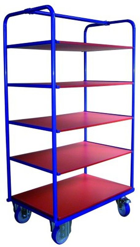 Rayonnage roulant de 5 hauteurs (60Kg / tablette) ouvert sur quatre côtés, tube encastré et profil en acier soudé. Panneaux en fibre de bois d'une capacité par tablette de 60 Kg et 350 Kg à la base, roues en caoutchouc, 2 fixes et 2 pivotantes avec frein. Distance de 285 mm entre les étagères. FOURNI DÉMONTÉ Également appelé: Rayonnage roulant avec plateaux. Référence 4018 Dimensions (mm) longueur x largeur x hauteur 900x600x1.720 Roulettes fixes Ø 150 Roulettes pivotantes Ø 150 avec frein Pneu Caoutchouc Poids Kg 52 Charge Kg 600 (60Kg / tablette)