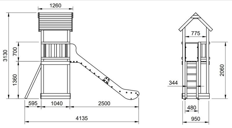 Medidas de la torre con tobogán Borealis Inox (con rampa de tobogán de acero inoxidable y paneles de PEHD):
